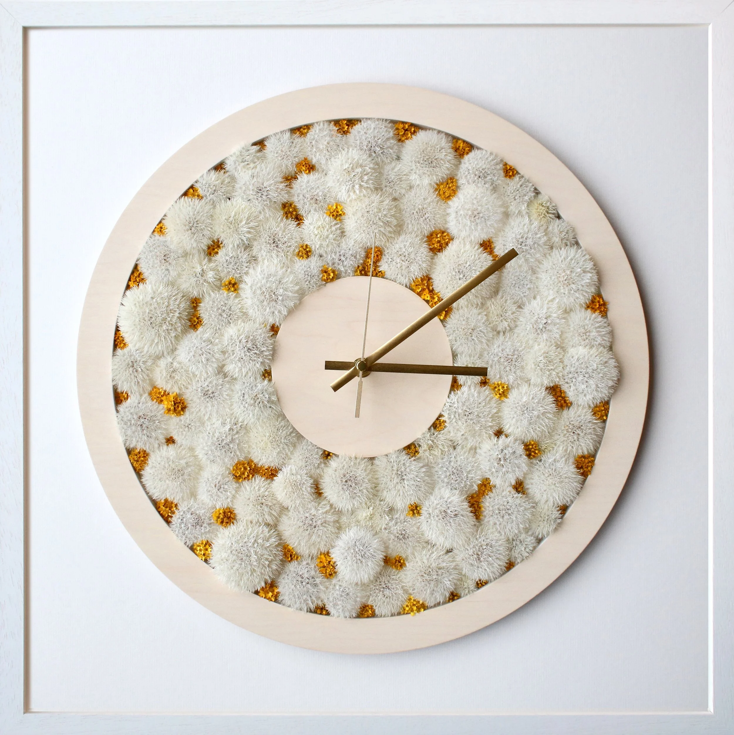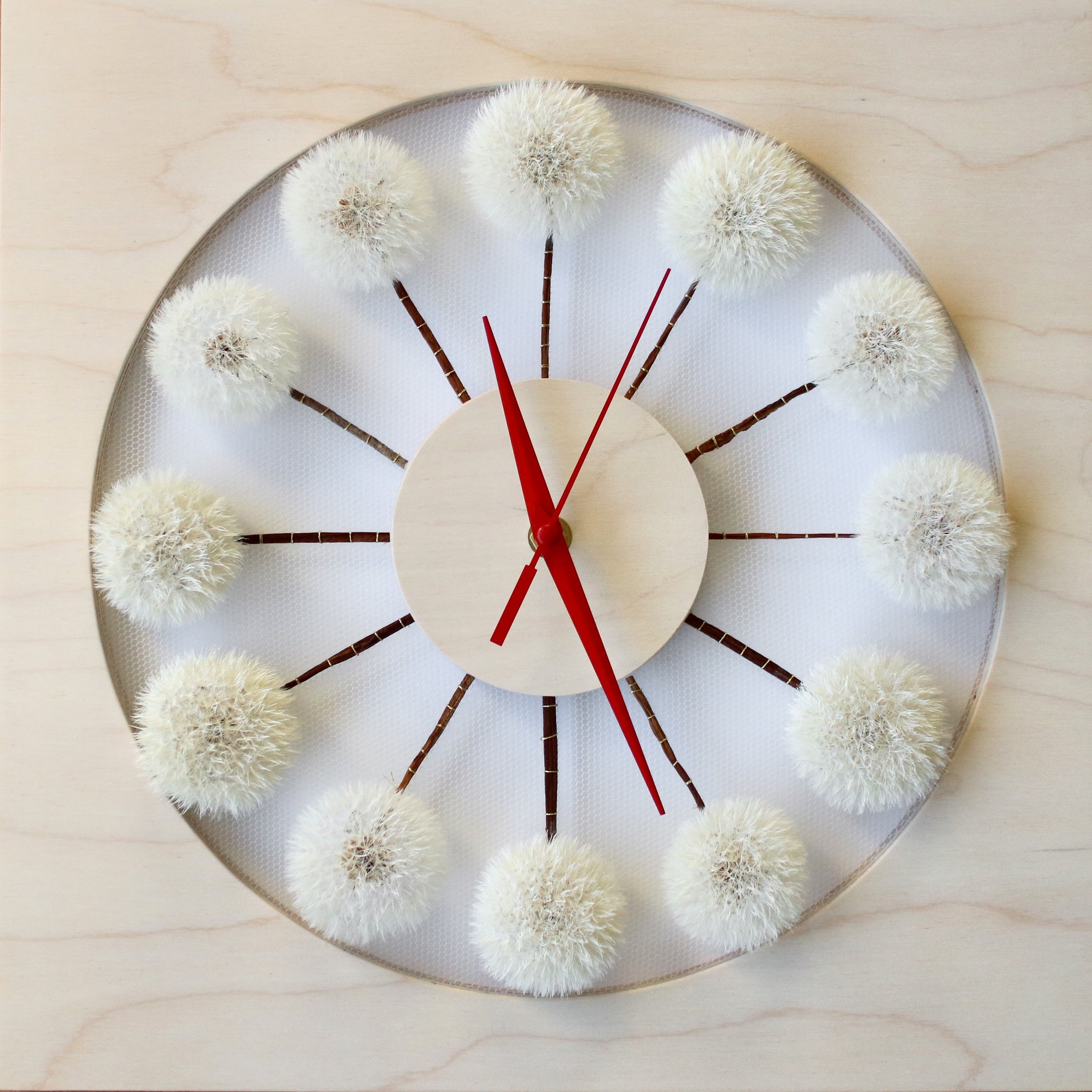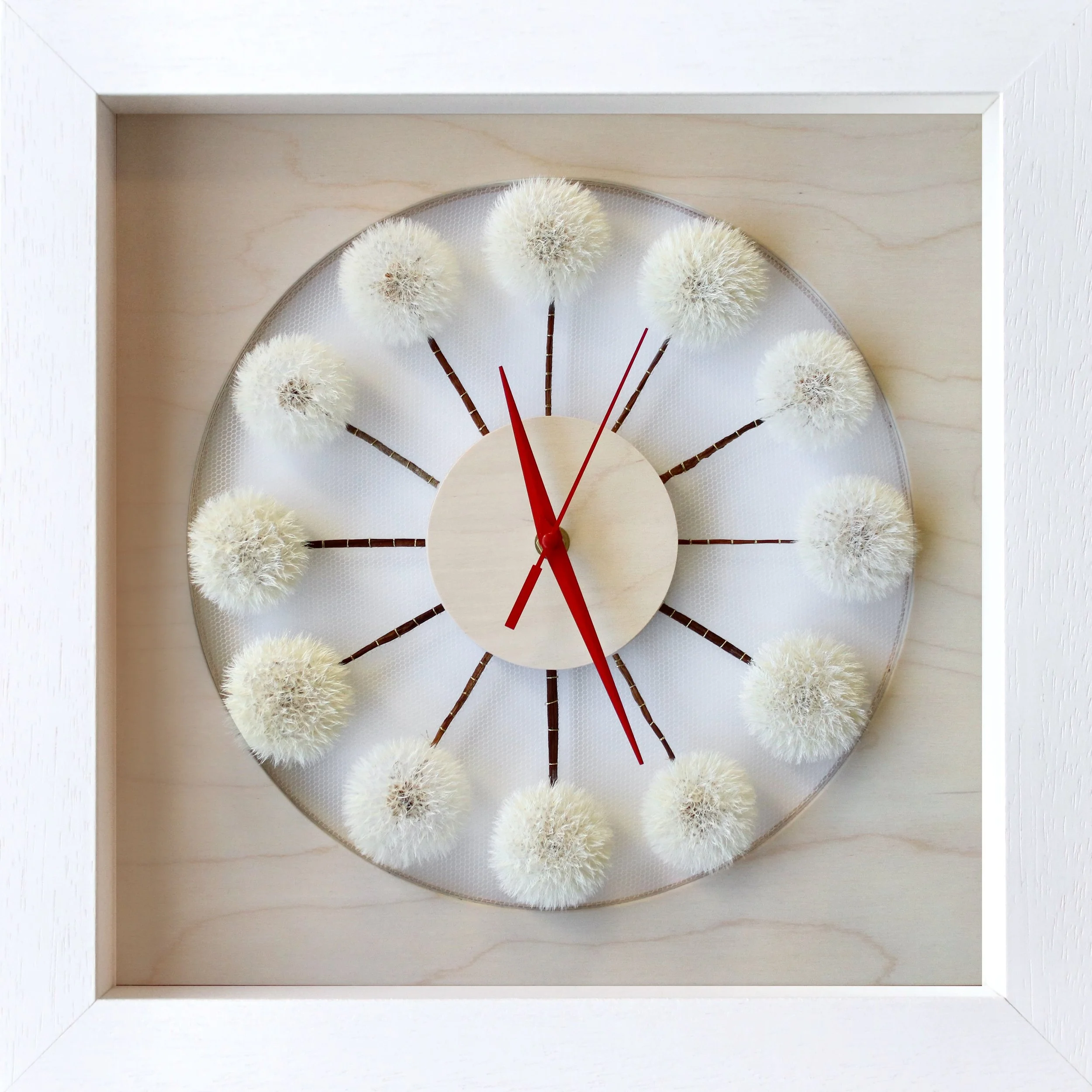 A series exploring the notion of time. These clocks are created with foraged dried dandelion seed heads - a nod to the childhood game of telling the time by blowing the seeds off a “dandelion clock”, but intended also to invite reflection on the transience of life, and the balance in nature between resilience and fragility: dandelions are among the hardiest plants, capable of growing seemingly anywhere, while their seed heads are among the most delicate and challenging of organic materials to work with. I’m able to make just one or two of these clocks each year, with dandelions I collect and preserve myself. My aim is for the “About Time” series to comprise 12 clocks, one for each hour of the day, each with its own unique design. Please note that these are art objects, not actual functioning clocks - although unlike the childhood method of blowing on the seed heads, they are at least guaranteed to be accurate twice every day. All clocks are framed in wooden shadow boxes and art glass.